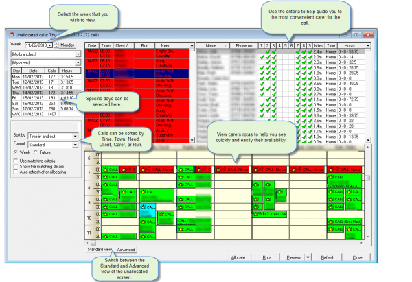 The Advanced View of the Unallocated screen, gives you more of a visual experience, showing Carers Rotas making it very quick and easy to view a Carers availability.