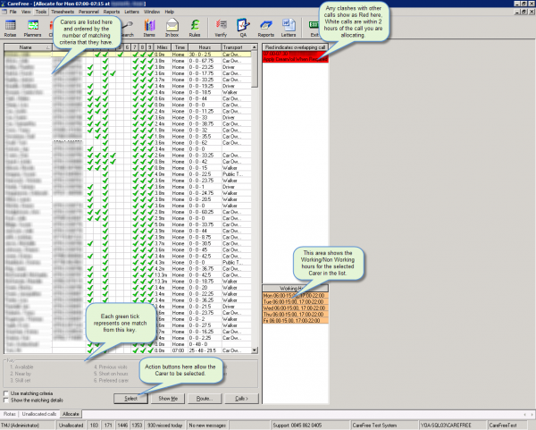 The Allocation Screen suggests the most suitable Carer for the call using a series of matching criteria which are indicated on the screen by a series of green icons. The key at the bottom left of the Allocation Screen indicates which of the fields refer to which criterion.