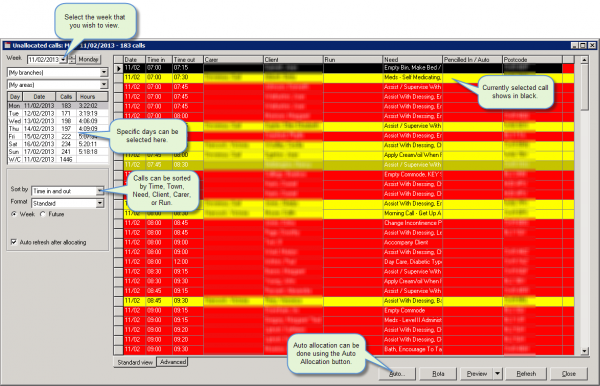 Top Tip: When viewing unallocated calls note that calls will appear in red except time critical calls, which appear in a mustard colour, where the Carer is away these calls will appear in yellow, and the specific call that is highlighted, which appears black.