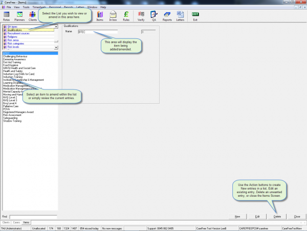 Within CareFree it is possible to select from many different lists in order to populate fields with information. Rather than these lists being set by Ourselves using our terminology, the software allows you to set your own lists and as such use your own wording and titles for the items you require. This means that you can tailor the software for your organisations needs.