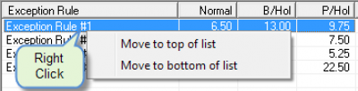 These rules are looked at in top-down fashion. In other words, the first rule on the list is looked at first, if a call does not meet all of the criteria set it will then look at the next rule in the list. It will keep doing this until it finds a rule that matches or failing a match it will then use the default hourly rate. The general rule of thumb is the more conditions you have ticked, the higher up the exception needs to be.