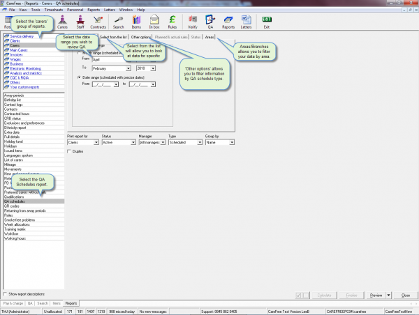 There are two main ways to view the details and activity held within the QA area of CareFree. Within the reports screen you can view carers QA schedules by choosing the following options.